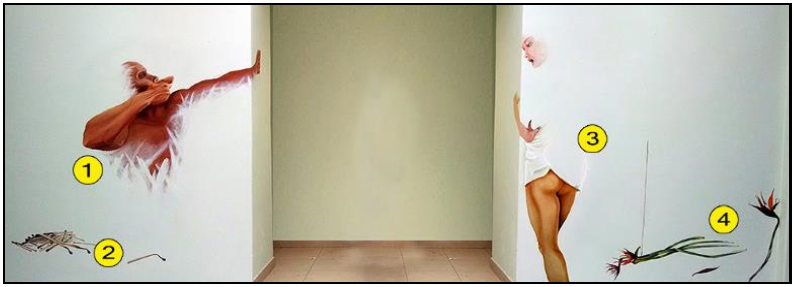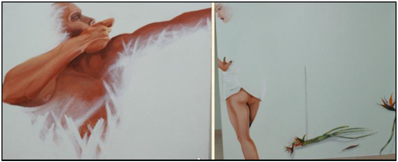 Aunque en ambos muros se muestra una pareja, nos puede remitir en general a casi cualquier mito que refleje la unión en pareja de cualquier cultura como el de Apolo y Dafne incluso Adán y Eva. Pero por las flechas podemos identificar primeramente al mito de Eros y Psique, también referiremos el mito de Apolo y Dafne. Ulises Gutiérrez Bonilla creador de la obra comenta que estos son personajes fusionados con el edificio y que aunque para algunos pudieran parecer inacabados para el son seres que emergen o se ocultan en el muro, inspirado en los prisioneros de la academia que se encuentran en la ciudad de Florencia Italia, donde magistralmente fueron ejecutados por Michelangelo Buonarroti (Miguel Ángel) escultor italiano. Innegable influencia renacentista para el autor así como el pintor Michelangelo Merisi Caravaggio. Un elemento adicional son los cerillos y las flores que metafóricamente pueden representar las flechas de Eros (o cupido para los romanos), que cuando su punta era de oro enamoraban pero cuando estas eran de plomo causaban el odio, por lo que encendidos los cerillos son el oro y apagados el plomo, así como las flores con vida y muertas respectivamente. |
