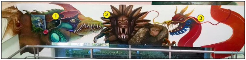 1: Dragón De lado izquierdo se encuentra un dragón europeo, como se puede observar en la mitología cristiana, ser que encarna al mal. En un recuadro se observa la figura de San Jorge, patrono de los ingleses que, según la mitología cristiana, mató a un dragón. Junto al cuadro se puede observar una lata de Coca-Cola, elemento contemporáneo que además de hacer referencia al predominio capitalista e imperialista, a la vez que hace la referencia histórica de la “revolución industrial” nacida en Inglaterra, además permite fechar de manera original el mural. Ya que durante el mundial de futbol celebrado en Brasil 2014, la empresa creo la promoción de colocar nombres y compartir el producto con sus semejantes. Con lo que al paso del tiempo podremos recodar el momento histórico en el que fue creado este mural. 2: Quetzalcóatl En el centro se encuentra la representación de Quetzalcóatl (serpiente emplumada) típica de Mesoamérica, representante de la cosmovisión dual pues vinculan a un animal terrestre con las plumas que son un elemento celeste, es uno de los dioses más importantes del panteón mesoamericano. De igual forma es de las deidades más antiguas, presente en una gran variedad de culturas como los teotihuacanos, mayas y mexicas. Para el autor y para muchas personas puede representar un dragón prehispánico al ser una serpiente con plumas capaz de alzarse en vuelo. 3: Long De lado derecho se encuentra el dragón asiático representando principalmente en la mitología china. Este animal mítico está conformado con las partes de otros animales, como los bigotes de bagre, cuernos de ciervo, patas de águila, etc. Su representación varía en el tiempo, incluso con diferentes dinastías, por ejemplo en algunos casos se le colocan alas de murciélago y en otras no. Es una representación de la dualidad, elemento también muy común en la cosmovisión china, el dragón representa la masculinidad. |