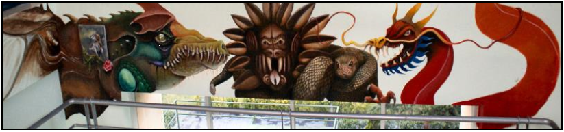 Esta composición de cuatro murales, muestra el encuentro mitológico de tres continentes, de lado izquierdo el europeo representado por la cultura nórdica, en el centro el continente americano, representado por dos de las culturas mesoamericanas más populares: los mayas y mexicas, también conocidos como aztecas. De lado derecho, el continente asiático representado por la cultura japonesa, muy similares entre sí. Como preámbulo de estas conexiones tenemos tres dragones que si bien, pareciera que hacen referencia a un mismo animal mítico, podemos identificar las diferentes cargas ideológicas que se puede tener de un mismo elemento en diversas civilizaciones: mientras para el viejo continente es un símbolo de maldad, fuera y dentro de la ideología cristiana, por representar a una bestia o al diablo. En Mesoamérica es una deidad, incluso uno de los más importantes, por el sacrificio que realizó en beneficio de la humanidad. Para los chinos, por otra parte, es un símbolo de la fuerza, poder y masculinidad. Presente en muchas de sus festividades religiosas y en su cosmovisión en general. Podemos así, con ayuda de este mural, conocer y comparar las diferentes mitologías que existen en el mundo. |