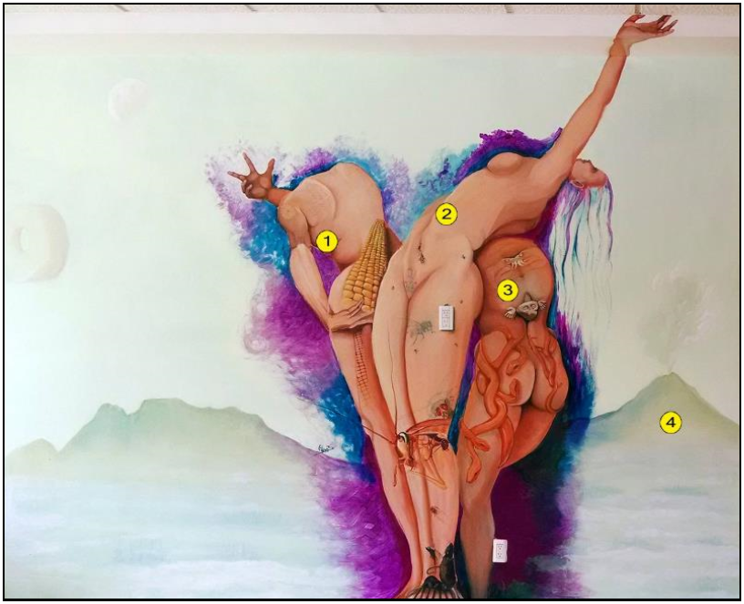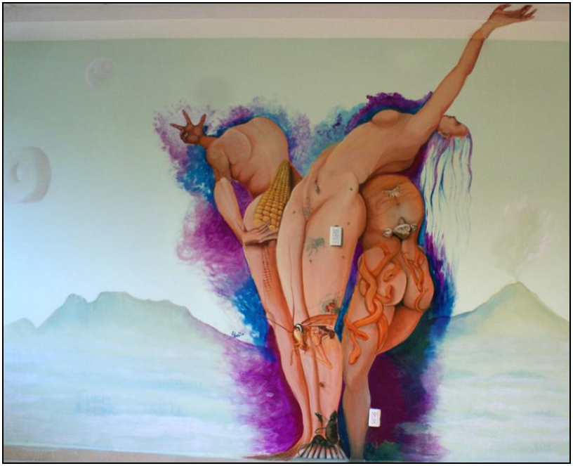 1: Chicomecóatl (Diosa del maíz) Su nombre significa en náhuatl “Siete-Serpiente”, se trata de la antigua diosa del maíz y, en general, de las plantas comestibles y mantenimientos. Se le representó en los códices y en la escultura con un tocado de tiras de papel y con frecuencia porta mazorcas de maíz. Esta planta fue la base del desarrollo y la economía de las sociedades prehispánicas de Mesoamérica, por lo cual el culto a esta deidad era de gran importancia. 2: Tlazolteotl (Diosa de la inmundicia) Su nombre náhuatl significa “Diosa de la basura”, nombre que muestra una metáfora en la cual la basura se equiparaba a la actividad sexual –gracias a la cual el género humano logra perpetuarse-, de manera que la diosa era la patrona del deseo, la lujuria, el sexo y la fertilidad humana. Se le consideraba también protectora de las parturientas. En los códices donde se le pintó aparece semidesnuda o desnuda enfatizando su sexualidad. En el mural está diosa está caracterizada con algunos insectos y animales vinculados a nuestra idea moderna de inmundicia, moscas, cucarachas, ratas e inclusive una atarjea, se le puede observar en forma de piercing (perforación) y tatuaje a la figura con la que es personificada comúnmente en los códices. La sexualidad en esta figura es representada por el contacto eléctrico en el muslo de la deidad, haciendo alegoría a la idea de energía creadora. 3: Coatlicue (La de la falda de serpientes) Su nombre náhuatl se traduce como “La de la falda de serpientes” o “La de enaguas de serpientes”, mismo que coincide con la mayor parte de sus representaciones plásticas donde incluye este elemento, símbolo de lo terrestre. Fue considerada la personificación de la tierra, la madre de los dioses (el sol, la luna, las estrellas) y de los hombres. Diosa mexica, de la tierra y madre de los dioses, representa la vida y la muerte. Madre de Huitzilopochtli (dios del fuego sol), Coyolxauhqui (la luna y las estrellas). Simboliza la tierra que en el horizonte que todos los días o noches tiene que parir a la luna, las estrellas y el sol; y al mismo tiempo quien los recibe después en su regazo de muerte, en un ciclo constante. Como lo indica su nombre porta una falda de serpientes en la escultura prehispánica (como se observa también en el mural), la escultura más famosa de esta deidad, presenta además una confrontación facial, dos rostros de serpientes que forman un tercero, del monstruo de la tierra (como el tatuaje en su espalda) en la pintura mural. 4: Iztaccíhuatl y Popocatépetl (Volcanes del valle de México) La vista que engalana a la ciudad más grande del mundo: la Ciudad de México, está realzada por la majestuosidad de dos de los volcanes más altos del hemisferio, se trata del Popocatépetl y del Iztaccíhuatl. La presencia milenaria de estos enormes volcanes ha sido de gran importancia en las diferentes sociedades que los han admirado y venerado, siendo fuente de inspiración de múltiples leyendas sobre su origen y creación. En esta ocasión sirven como marco perfecto para ubicar a esta tríada de divinidades terrestres y contextualizar al espectador en el valle del Anáhuac, así como también podemos apreciar al aro del juego prehispánico de pelota y a la luna. |