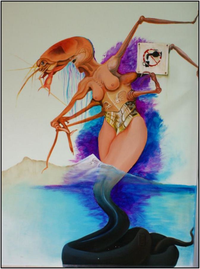 3: Agua no potable En el mural se representan también alusiones modernas como lo podemos observar en un desgastado letrero de señalética que representa el símbolo de agua no potable, invita a pensar sobre los problemas que se tienen en la actualidad por la contaminación y escasez de este vital líquido, pero sobre todo para hacer una profunda reflexión acerca de la perdida de nuestra propia identidad y de nuestras tradiciones con este elemento metafórico de precaución. |